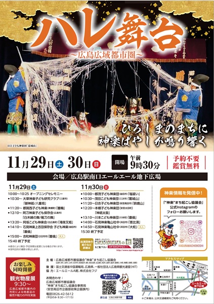 広島駅に広島県・島根県の神楽が大集合!! 各地域に伝わる勇壮華麗な神楽をぜひこの機会にご鑑賞ください。 浜田市からは、石見神楽亀山社中が出演いたします♪
